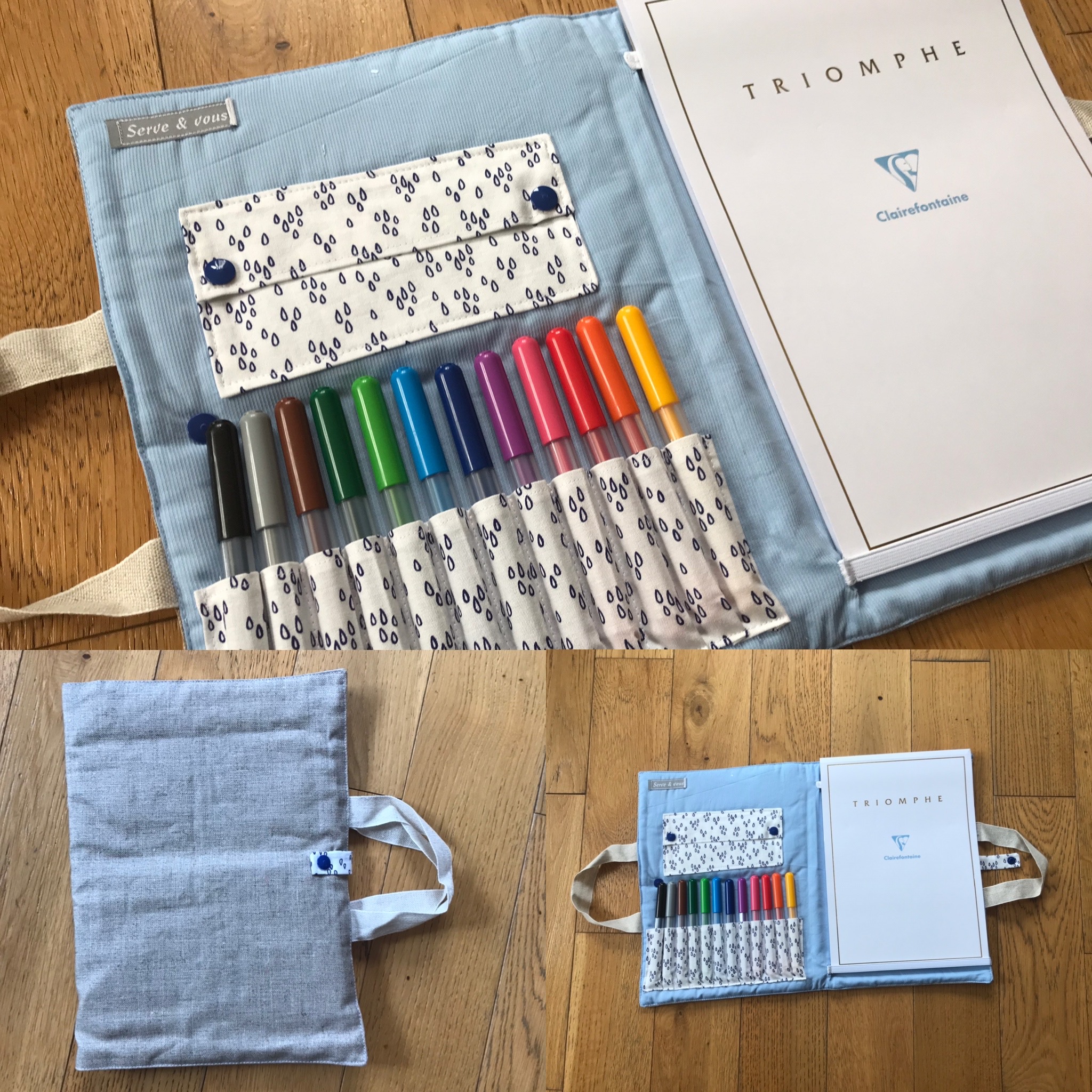 Coté gauche, une petite pochette fermée par deux pressions plastic (dimensions: 16cm x 8cm) permet de ranger gomme, ciseaux, … En dessous, un ingénieux système permet de ranger jusqu’à 12 feutres/crayons (dimensions: 8cm x 21cm) pour les rendre plus accessibles.