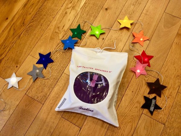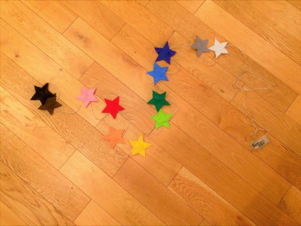 Guirlande lumineuse composée de 12 ampoules LED, chacune décorée d’une étoile en feutrine.