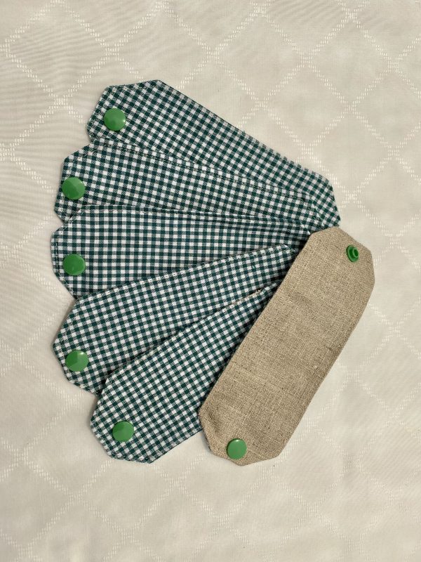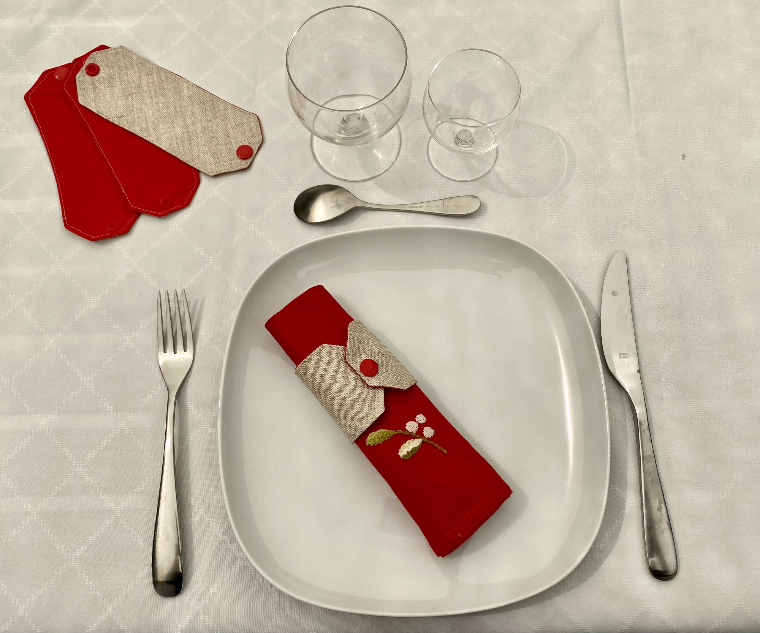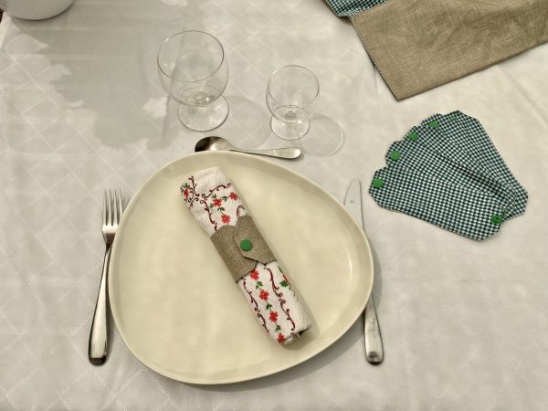 Pratique, ce rond de serviette en lin enduit doublé d’un tissu coton se ferme par une pression assortie à la doublure.