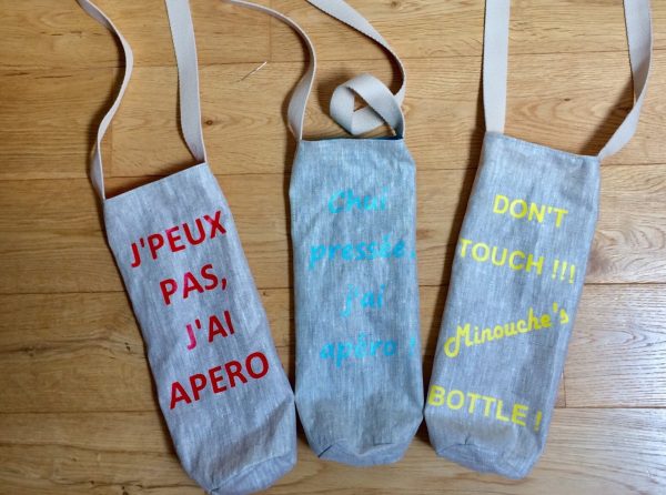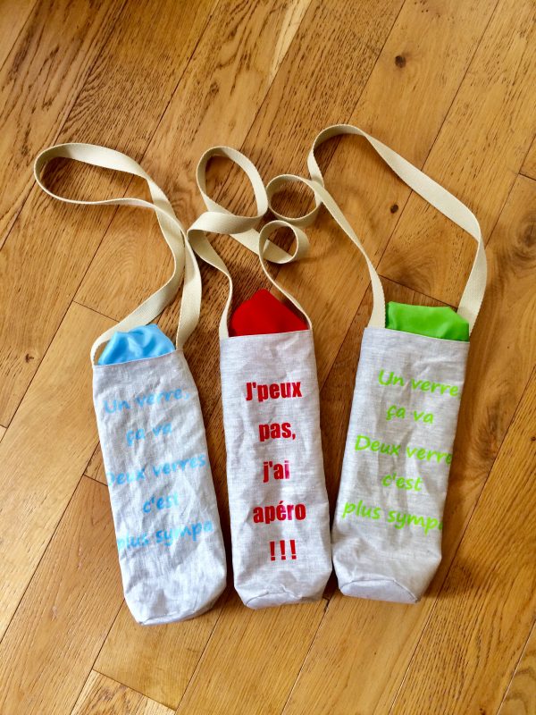 En lin enduit, ce sac à bouteille peut etre personnalisé avec la phrase (mots, date…) de votre choix dans une couleur assortie à la doublure.