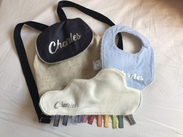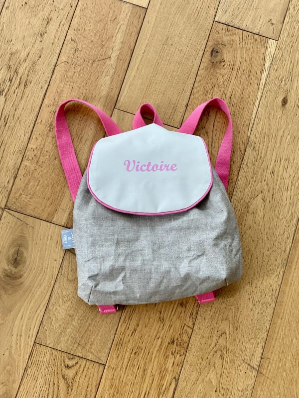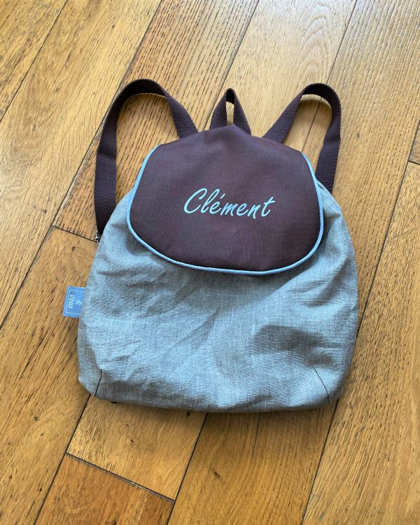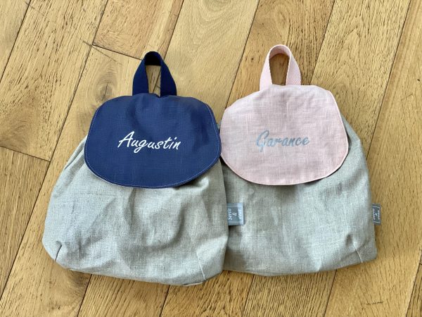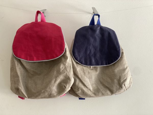 Sac à dos en lin enduit doublé d’un tissu imperméable (dans la mesure du possible assorti) pour mettre l’indispensable des touts petits en crèche/nounou ou en maternelle.