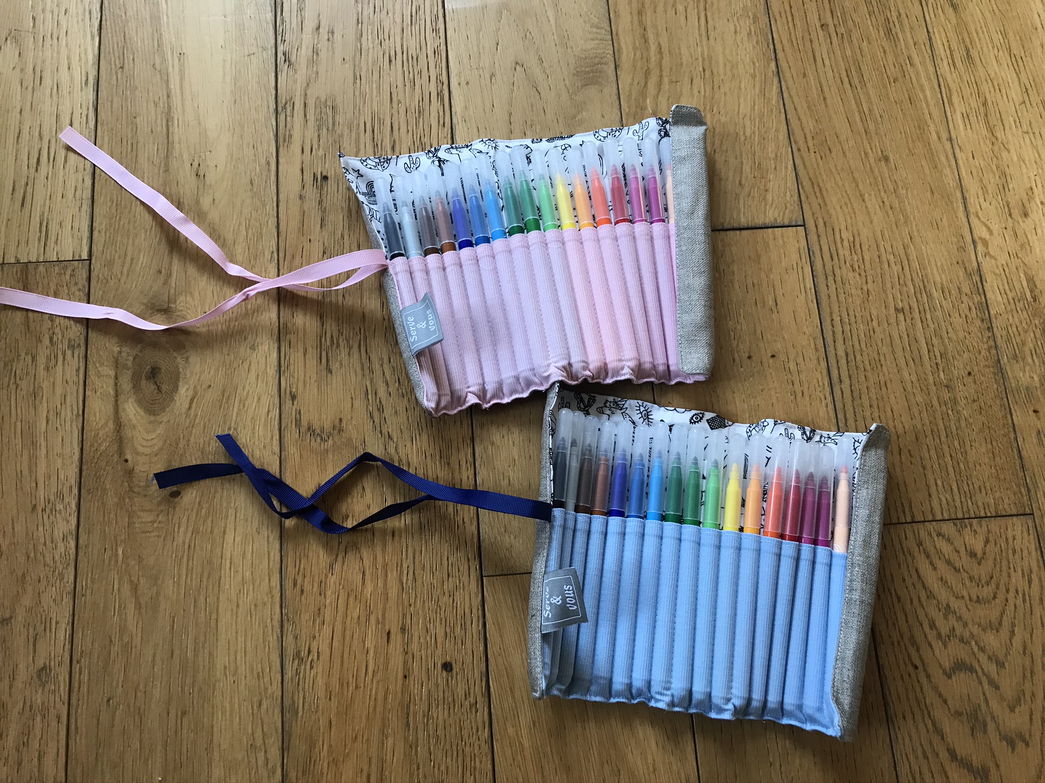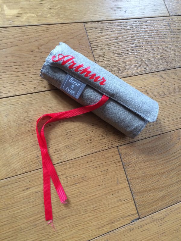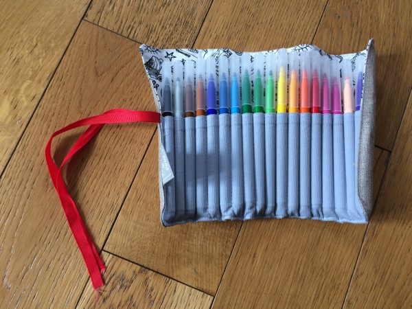 Cette trousse en lin enduit est doublée d’un coton noir&blanc “coloriage”. Un empiècement en coton coloré dans lequel sont cousus des rainures permet d’y ranger 18 feutres (de marque Stabil*).