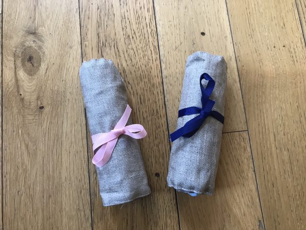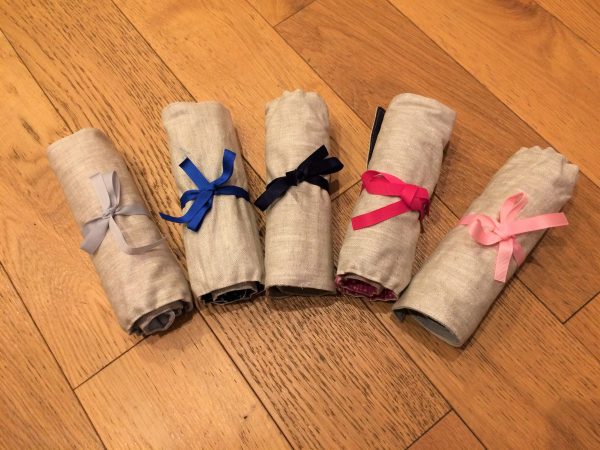 Cette trousse se ferme grace à deux liens de couleur coordonnée.